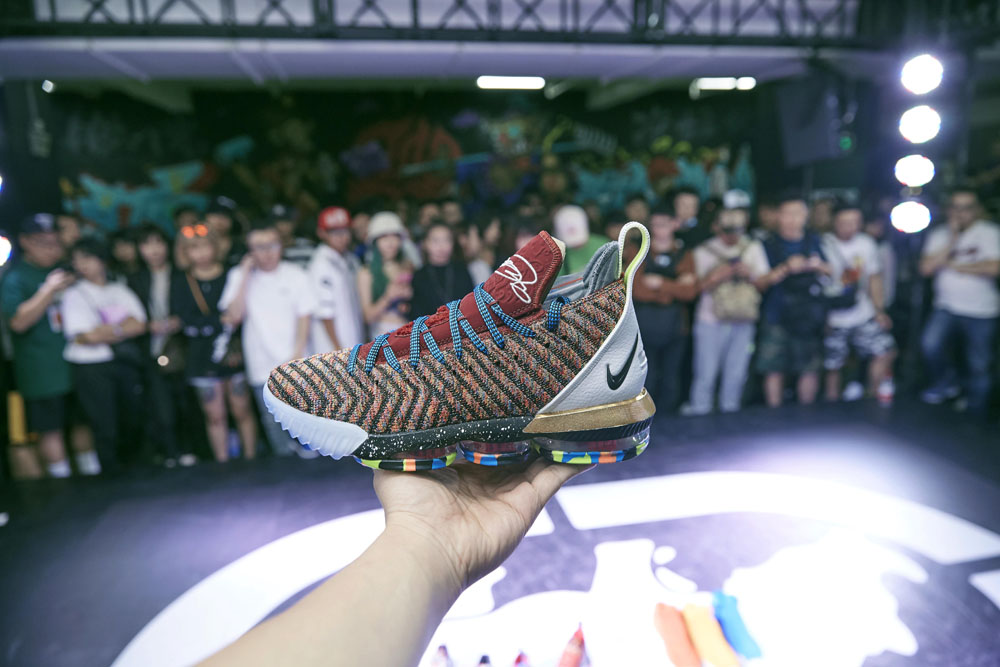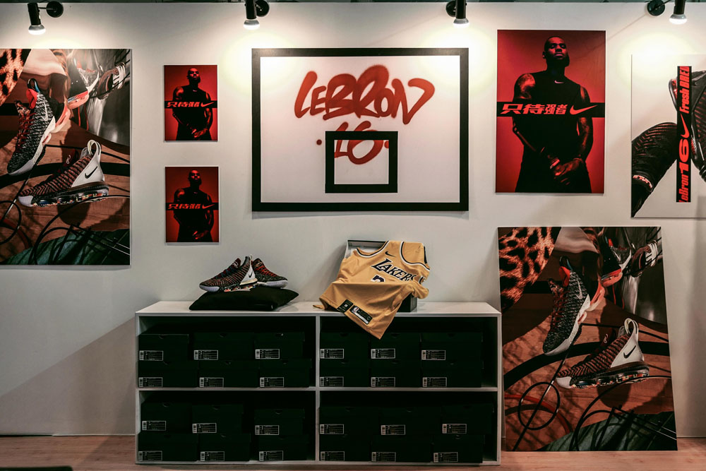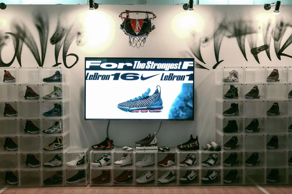 而对面的 Nike LeBron 主题专区则围绕最新登场的 LeBron 16 特别打造,同时带来了LeBron 历代签名鞋款的经典配色,以及 King James 在加盟湖人之后的全新球衣。