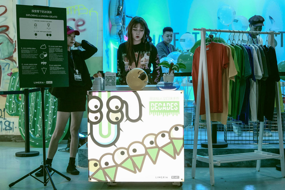 潮流店铺 DECADES 在现场为大家准备了手持喷码枪和丝网印花等趣味 DIY 体验,以及免费的 DECADES x LINGXIA GELATO LAB 意大利手作冰激凌。
