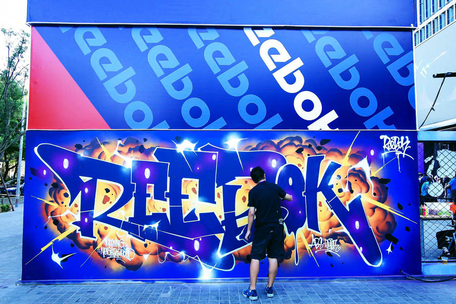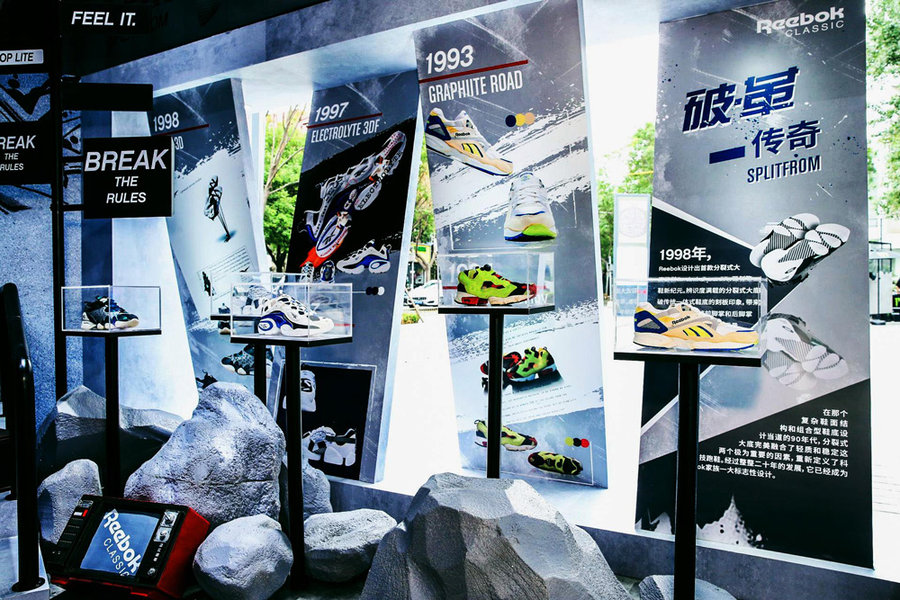 Reebok 的展位分为两个部分,其中在露天区域打造「破·革」Pop-Up Store,迎来了革新鞋款 3D OP. Lite 的正式亮相,特别邀请知名涂鸦团体 ABS CREW 现场创作,更集结了 20 年来 Reebok 分裂式概念的复古设计。