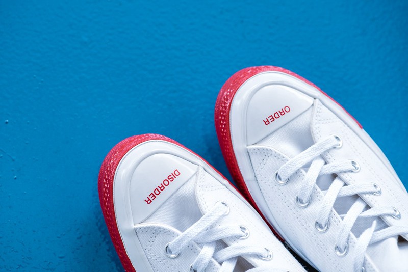 此外鞋头左右脚分别印有 “ORDER”、“DISORDER” 字样,不仅带有强烈的 UNDERCOVER 字体风格,同时旨在表达 18 秋冬秀场从 “秩序” 与 “混乱” 的转变主题!