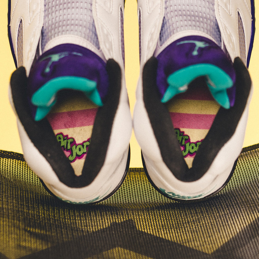 鞋款采用了活力十足的白紫葡萄装扮,最大的亮点在于 “无鞋带” 的设计,这一设计来源于威尔史密斯在《新鲜王子妙事多》的经典画面,他上脚没有穿鞋带的白紫配色 Air Jordan 5,给我们留下了深刻的印象。
