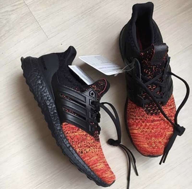 坦格利安龙配色的 adidas UltraBoost 鞋身以黑色为主,搭载黑色 Boost 缓震,与鞋头处红色和橙色编织的渐变设计形成鲜明对比,后跟处的红色标签上面写着 “Fire And Blood (火与血)”。