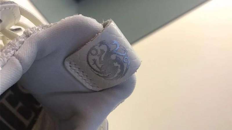 坦格利安家族配色鞋身则是以奶油白色为主,搭载经典银色三道杠设计,后跟同样以红色标签写道 “Fire And Blood (火与血)”。