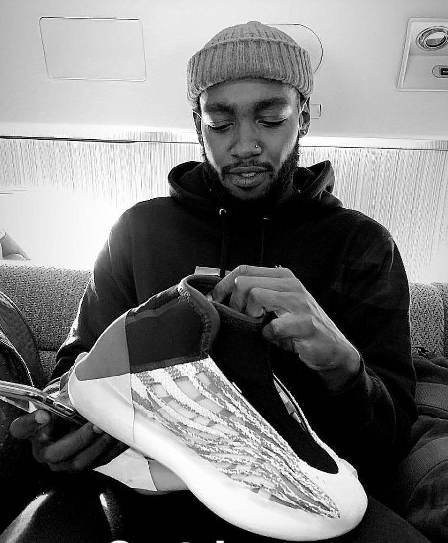 侃爷的亲着上脚,就展示了这双 Yeezy 篮球鞋独特的轮廓和撞色设计。