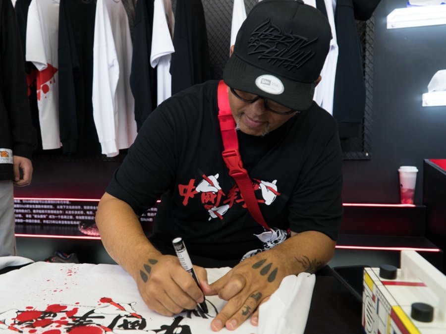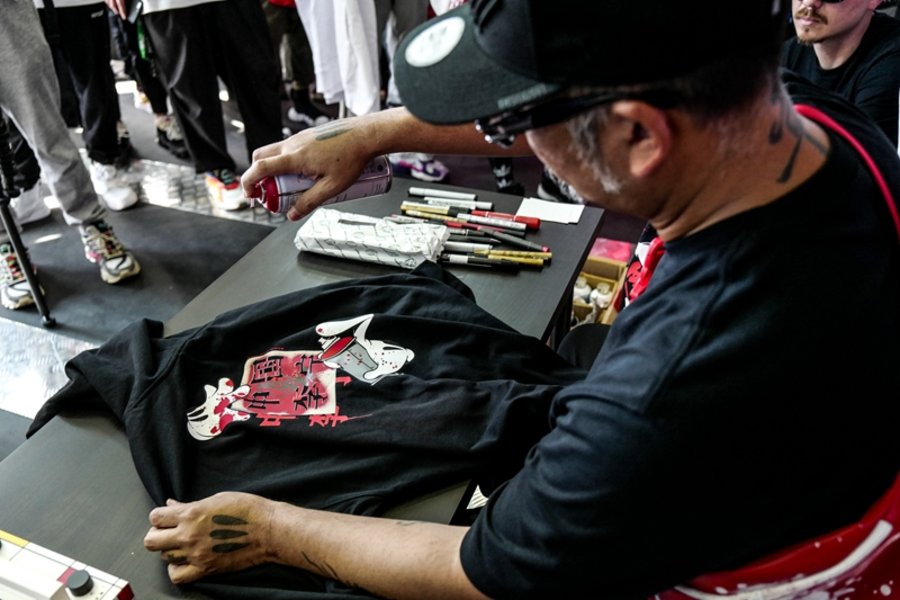 接下来 OG SLICK 为幸运粉丝耐心签售。与其说是签名,不如说是在单品上进行二次创作。OG SLICK 在签名之后,还会用喷漆在服饰上进行喷绘,为每位粉丝打造独一无二的定制版本。