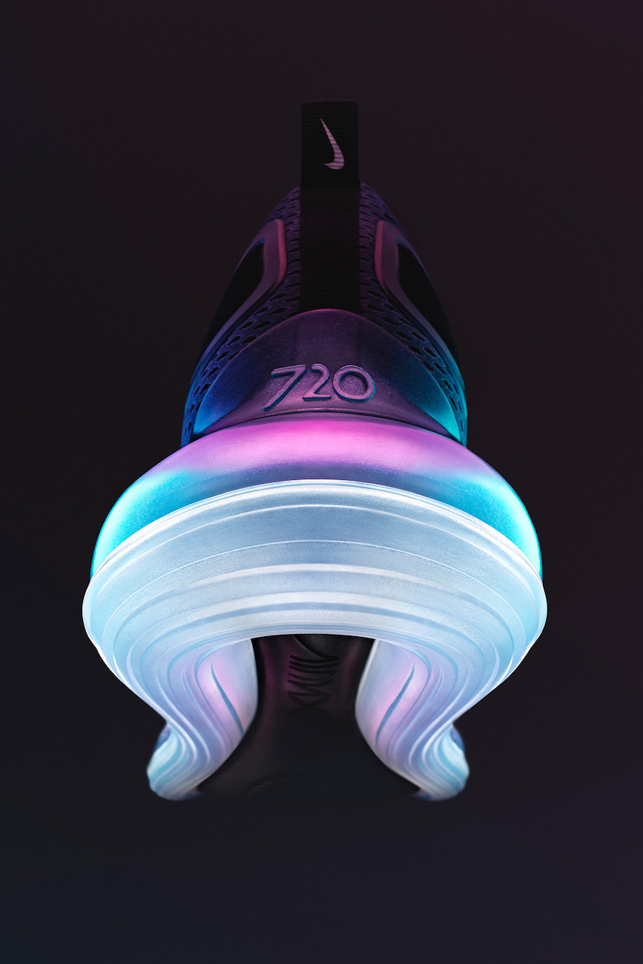 今年的 Air Max Day 是 Nike Air Max 270 的主场,而明年 2019 年的 Air Max Day,主角则是眼前这双 Air Max 720! 将 270 变化成 720,这双鞋款在造型上依然是辨识度超群! 从 Air Max 97 等经典鞋型上获取了设计灵感,除了有着超大的环绕气垫,Air Max 720 的未来科技感气质是它最主要的第一感受。