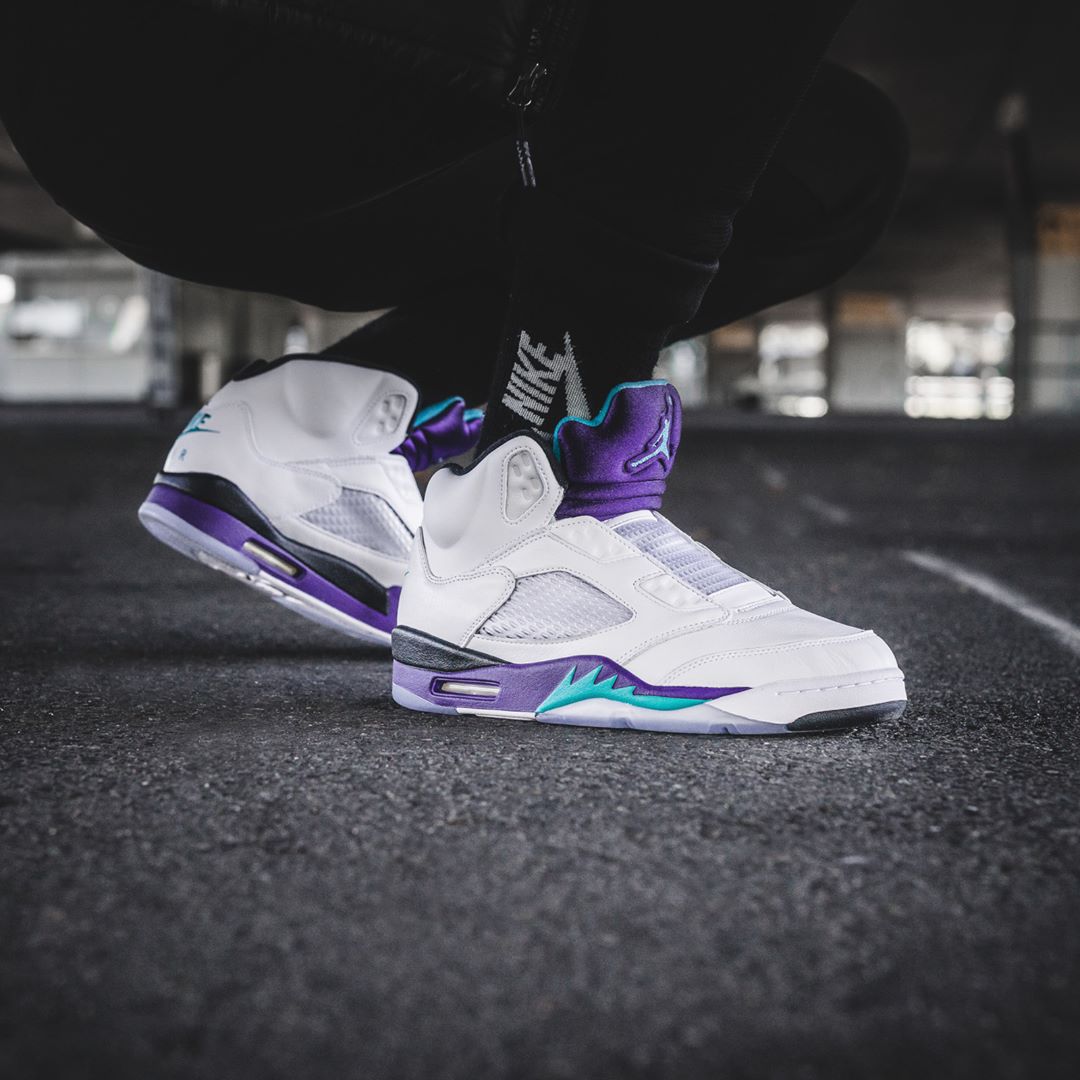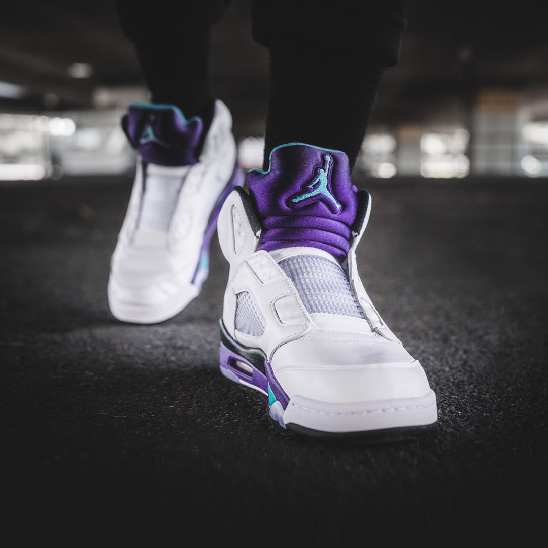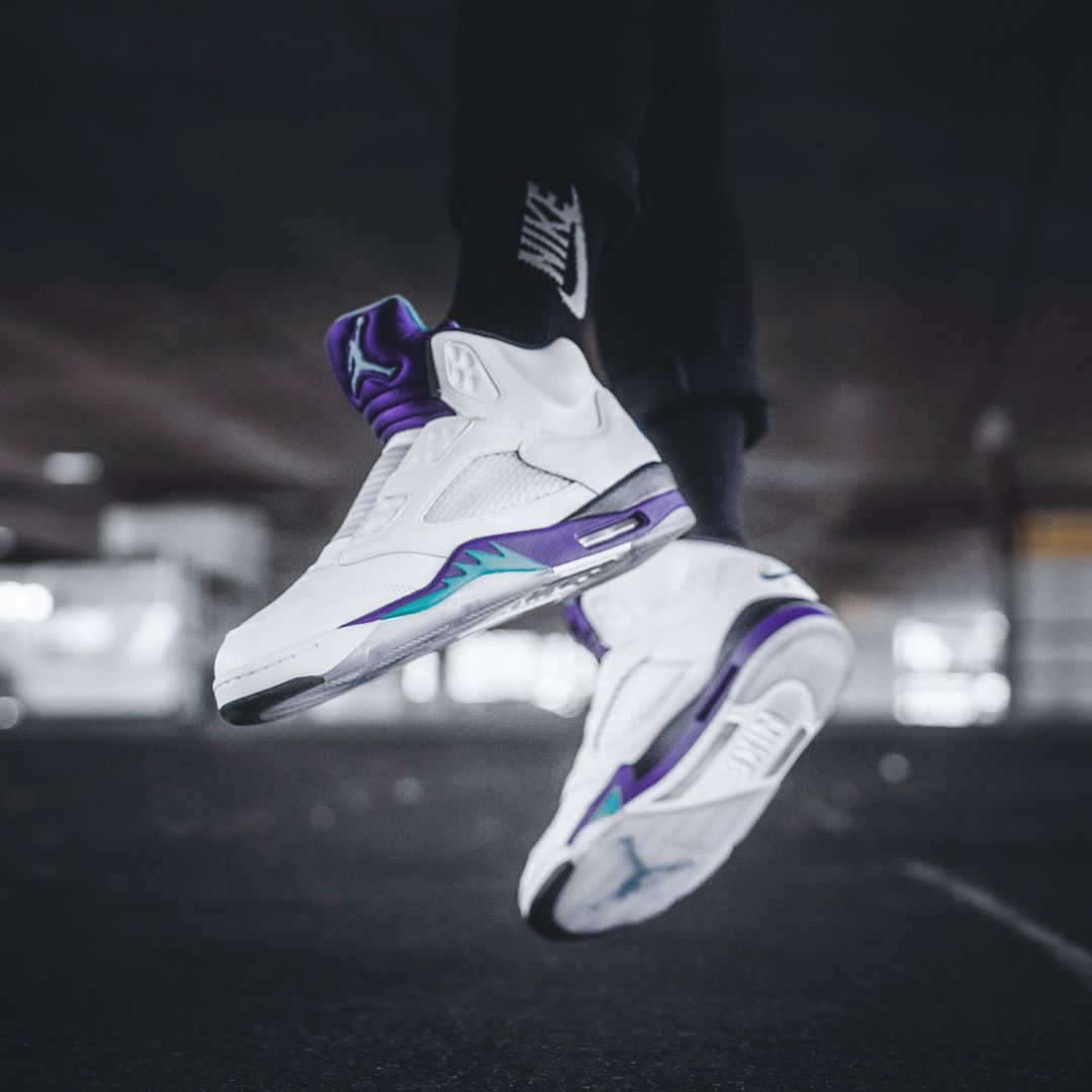 2013 年复刻的白葡萄 Air Jordan 5 “Grape” 拥有极高人气,目前市价已突破两千,而近期一款无鞋带版本的推出,也让不少小伙伴再度有机会入手这个清爽又明艳的配色主题。