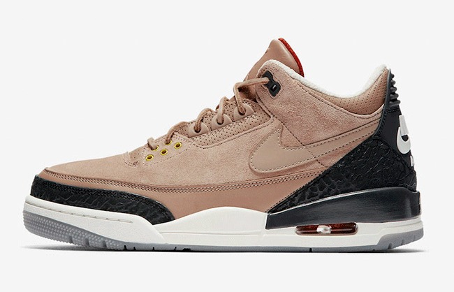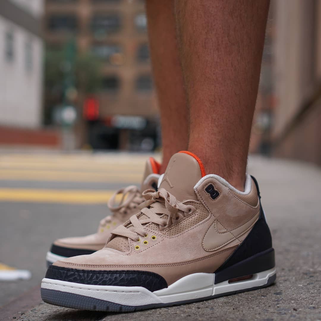 眼前这双 Air Jordan 3 JTH NRG “Bio Beige” 曾在快闪店中率先曝光,整体以卡其为主调,麂皮材质与和光滑皮革共同打造鞋面,两侧 Nike Swoosh 为 3M 反光设计,黑色爆裂纹及橘色点缀细节,后跟 Nike Air 彰显霸气。
