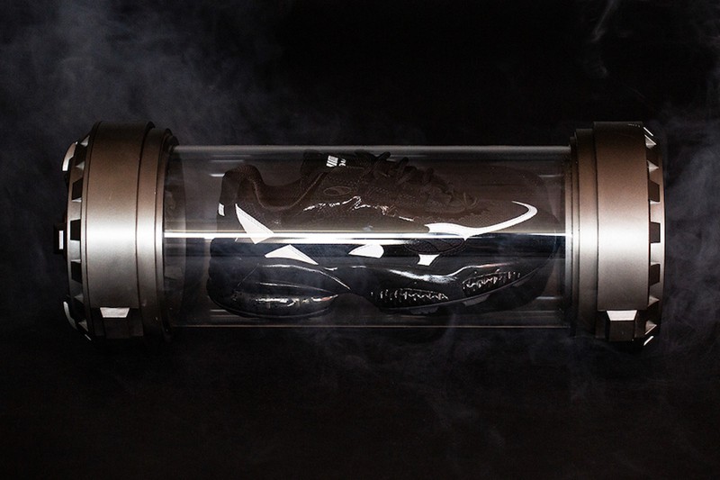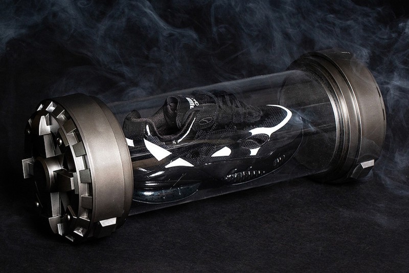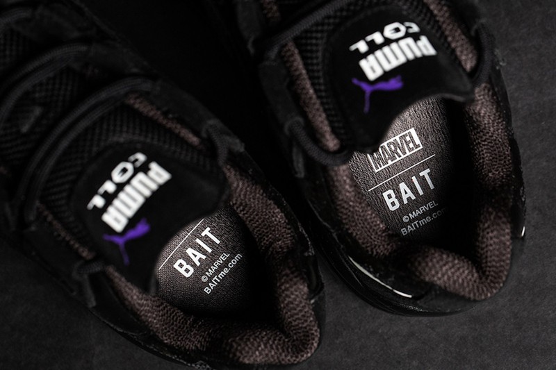 此外鞋舌上 PUMA 的 Logo 被涂以紫色对比,鞋垫上印有毒液的标志头像以及 BAIT 与 Marvel 联名标识。鞋盒是以模仿电影中储存毒液的原型 —— 外星共生体的生化玻璃罐外观打造,各种细节的忠实还原展现十足诚意!