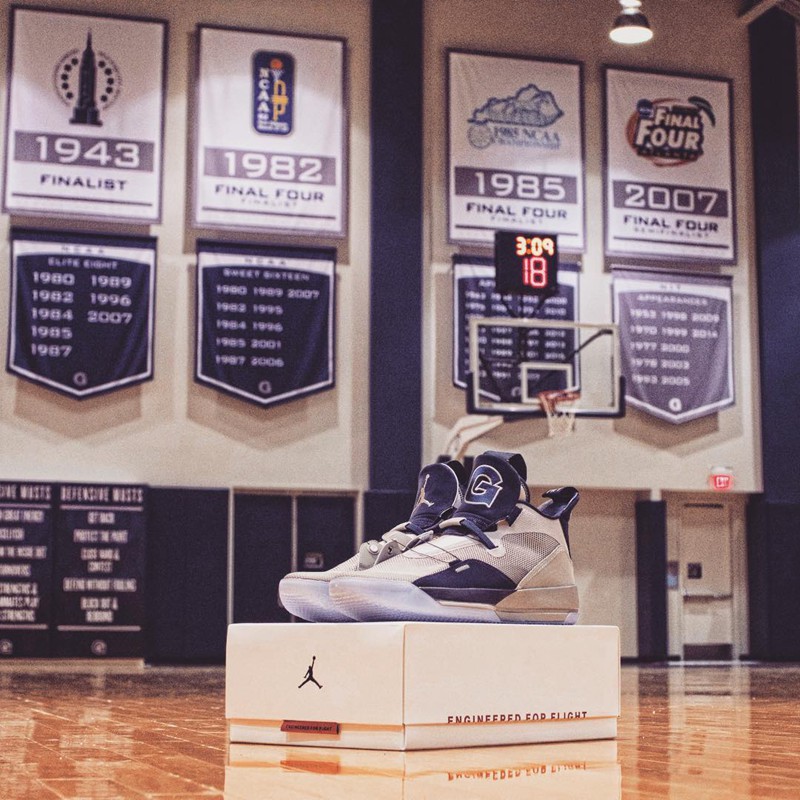 作为 NCAA 全美大学体育联盟第一梯队的强者,乔治城大学 “Hoyas” 惊叹队拥有大学队伍中为数不多可以享有 Jordan Brand 推出的 PE 鞋款特权。近期校队官方 Ins 账号就曝光了最新的 Air Jordan 33 PE 版本,同时也有配套队服一并亮相!