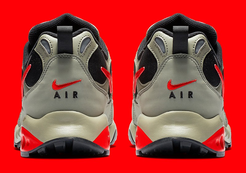 此双 Nike Air Terra Humara 依旧以防水的高密度尼龙材质辅以光面皮革,侧面太阳花般的放射状支撑鞋带系统。配色方面采用黑色 + 浅橄榄绿的经典户外风格方案,并点缀大红色于Swoosh、鞋带及中底开窗气垫等鞋身各处。