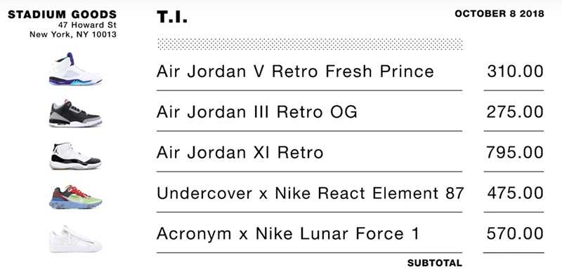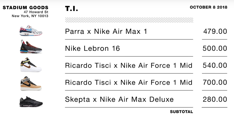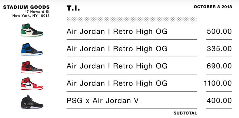 到了最后的购买环节,T.I. 挑选了黑绿脚趾、黑蓝、禁穿和芝加哥四款价格不菲的 Air Jordan 1 和多款其他 AJ 鞋款。