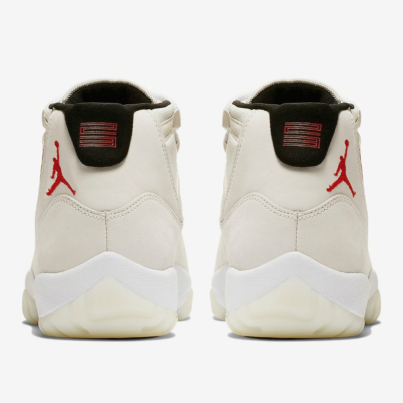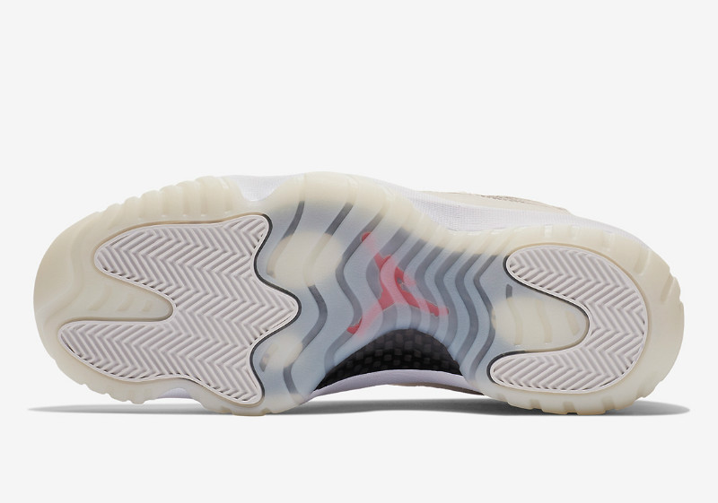 鞋身整体以米白色覆盖,后跟 Jumpman Logo 以及鞋帮处皮革轮廓、鞋舌标签等,均采用醒目的红色点缀,外底辅以类似 AJ11 大魔王配色的半透明果冻外底示人,视觉表现更为清新精致,同时也流露出简约的时尚气息,想必上脚表现也会格外出众!