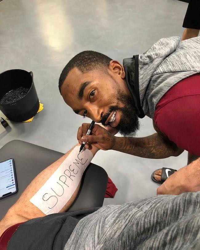 更在近日给自己的队友 Kevin Love 也在同样的位置 “纹” 上了 Supreme 的大 Logo 以示吐槽!