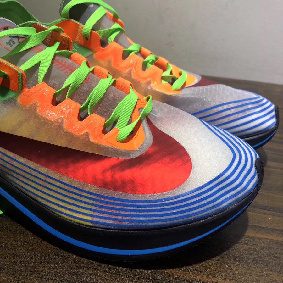 从照片中可以看出,鞋面是标志性的半透明蝉翼材质,而整体的配色方案也符合慈善系列的一贯风格,融入红、橙、黄、绿、蓝五种颜色,色彩上的大胆使用让整双鞋充满活力。