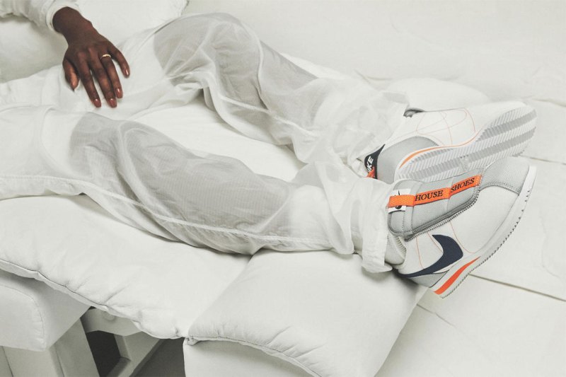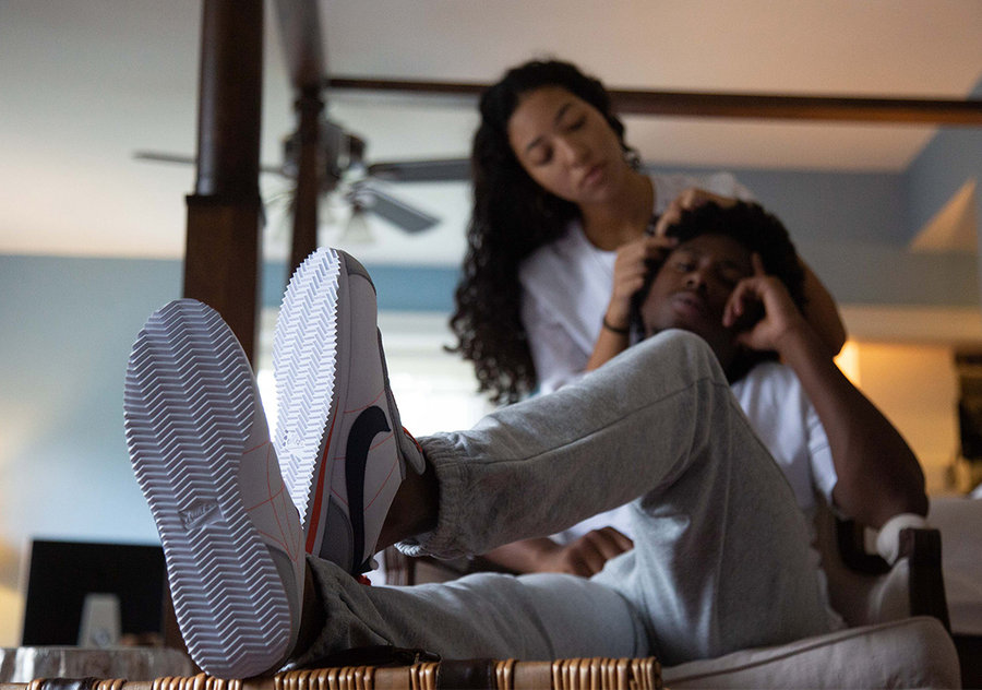 鞋面以灰白色为主色调期间点缀橙色细节。外侧 Swoosh Logo 为深蓝色布料拼接,而内侧则以橙色走线呈现,使造型更加独特。