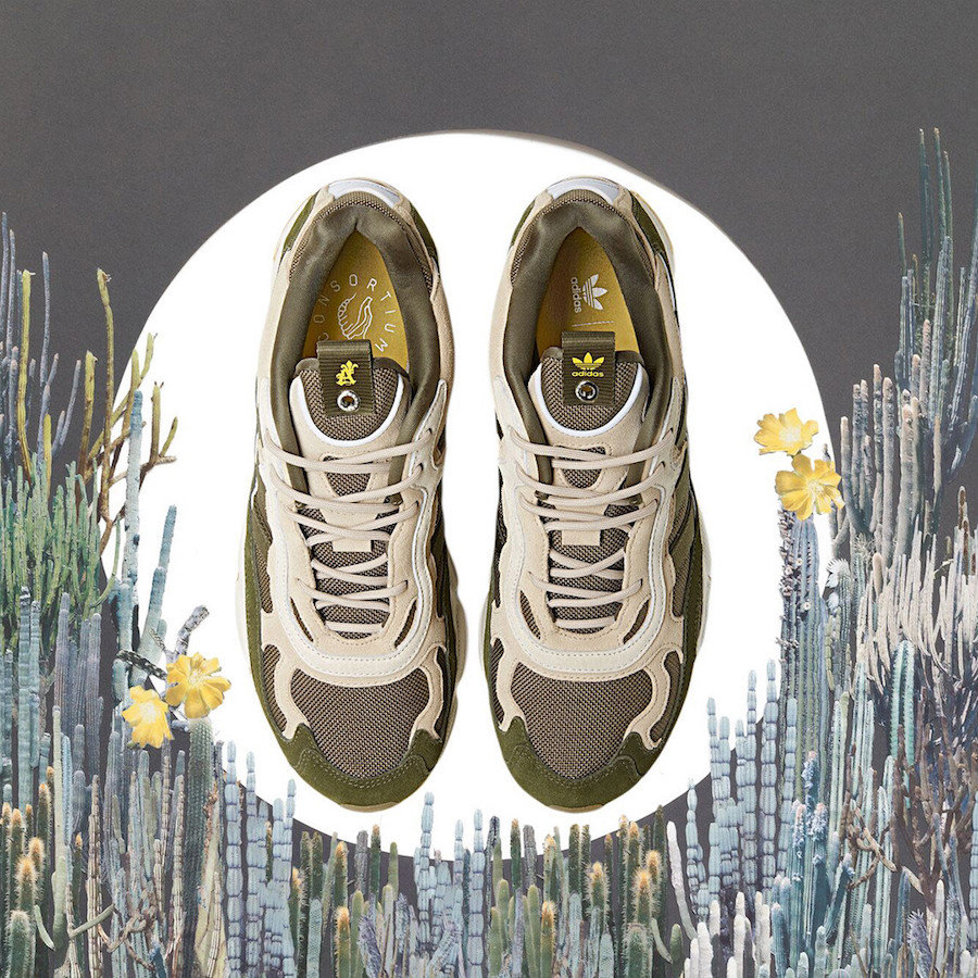 鞋身选用绿色、卡其色、棕色进行搭配,整体带来极强的复古风视觉冲击力。