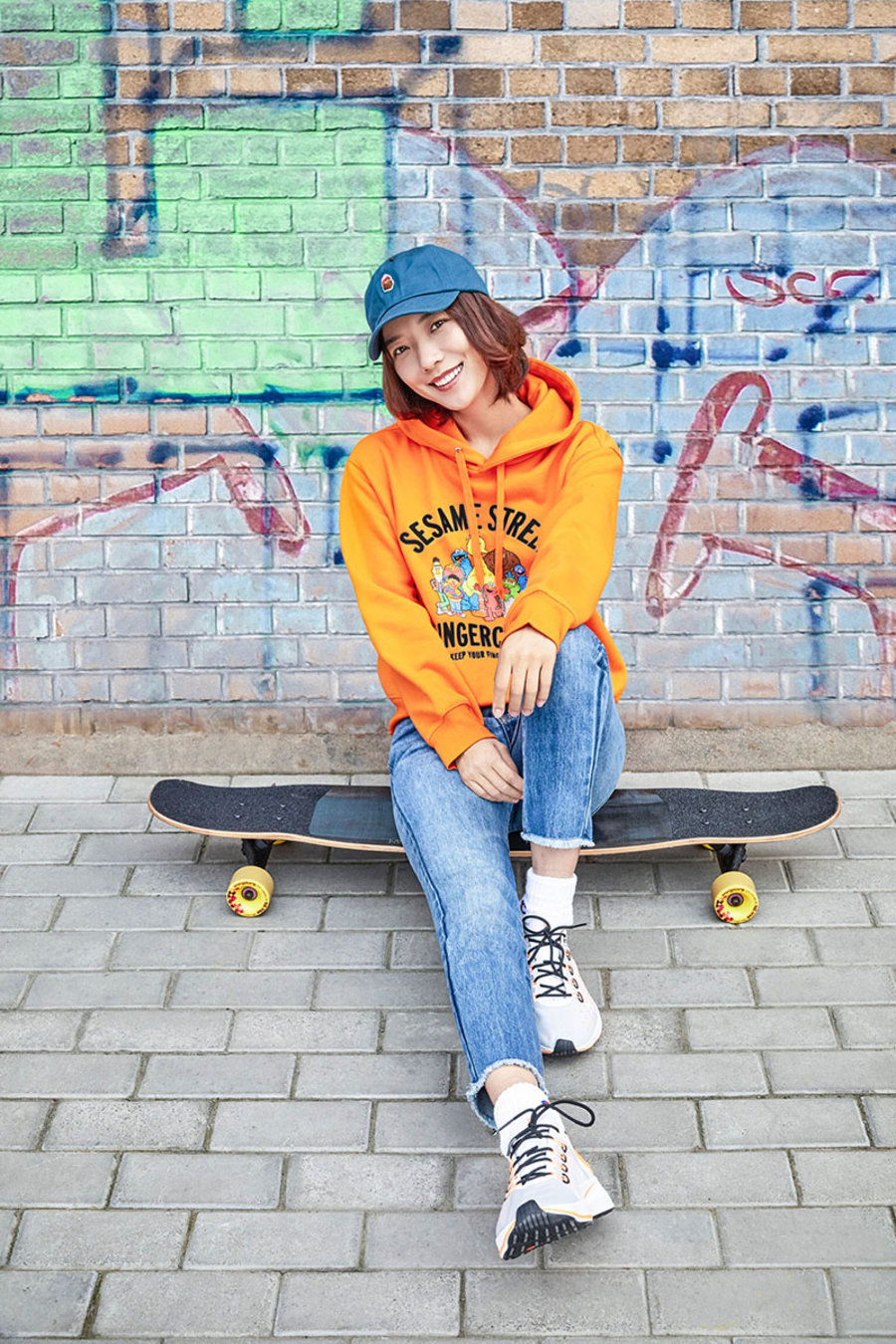 下面这组 Look 则通过橘色联名帽衫提亮整身穿搭,胸前街头感十足的文字与图案,将我们日常都有的弯檐帽、牛仔裤,搭配出干练洒脱的不羁气质,气场十足!