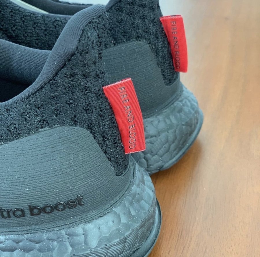 鞋面从前至后为红黄双色编织向纯黑色渐变,整体风格与坦格利安家族徽章的黑红色调相符。鞋面的支撑系统并没有一如既往使用 TPU 材质,而是以黑色皮革打造,展现出更强的质感,其他部分均以黑色装扮,中底 Boost 同样以黑色涂装。