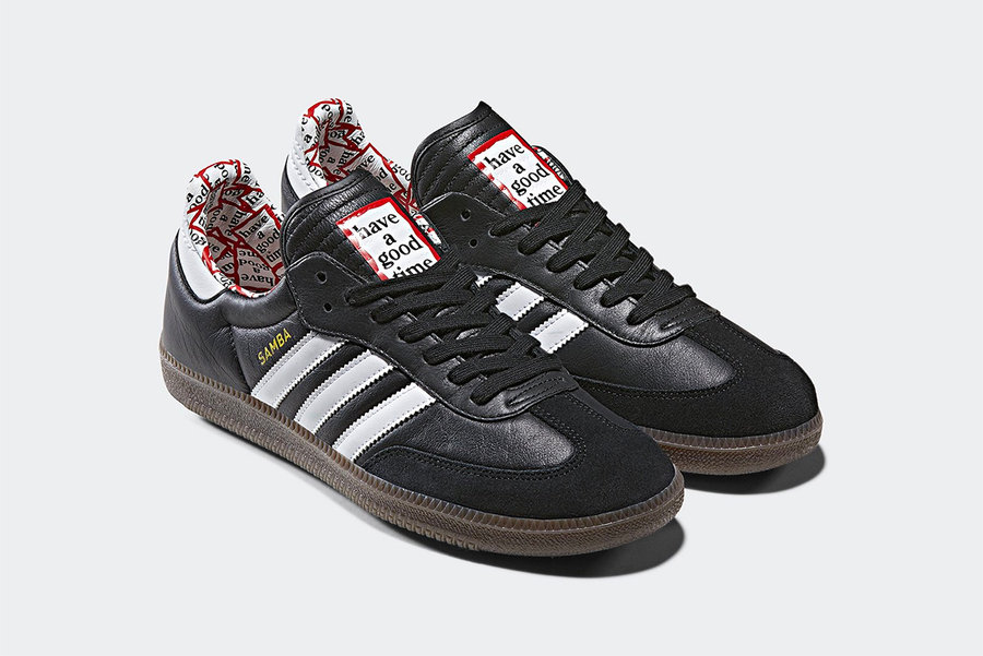 鞋款则选用了 Samba 鞋型,在黑白的经典简约色调之余,鞋舌的 Have a Good Time Logo 则彰显了其独特的身份。内衬也采用了全屏模式,细节效果不俗。