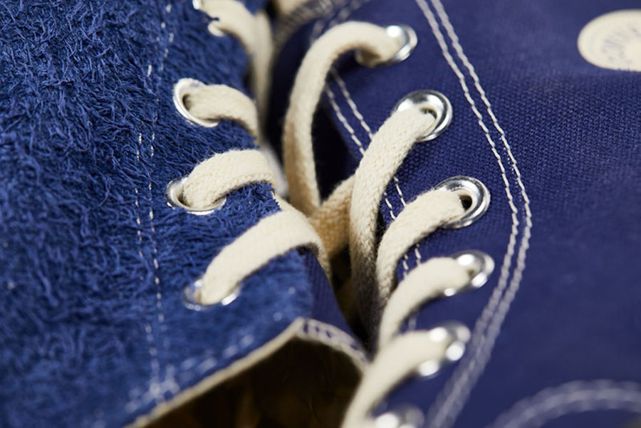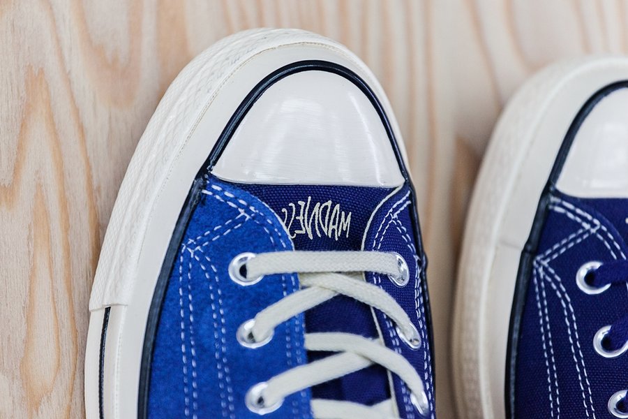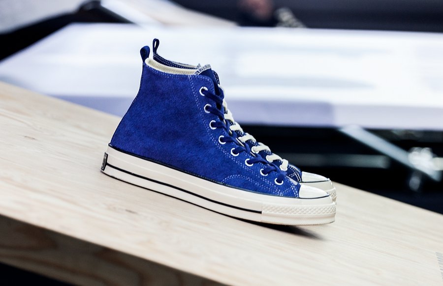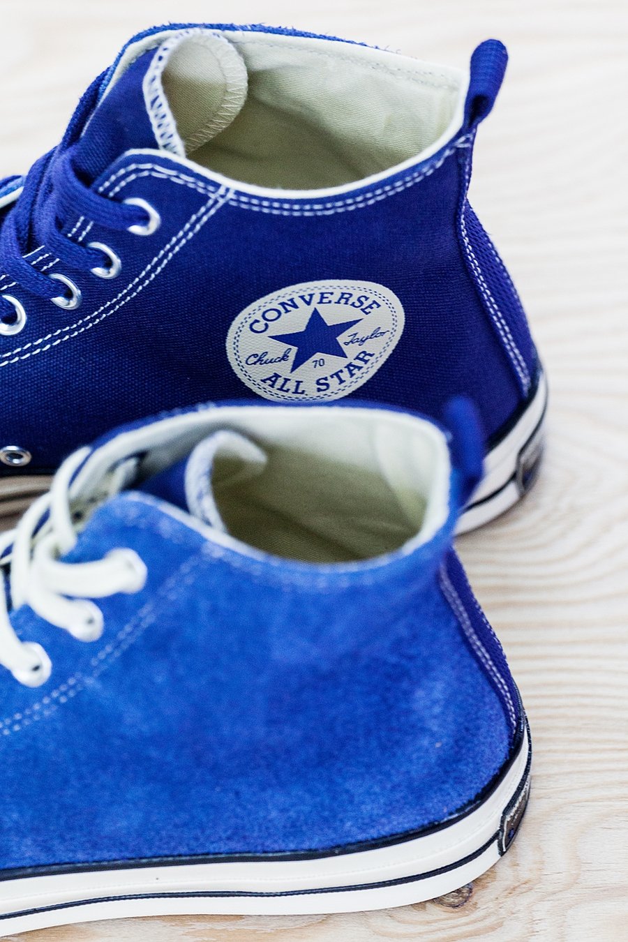 本次余文乐依然选择他最爱的 Chuck 70 鞋型,采用外侧高端绒面皮革混搭内侧有机帆布,呈现出蓝紫内外撞色效果。