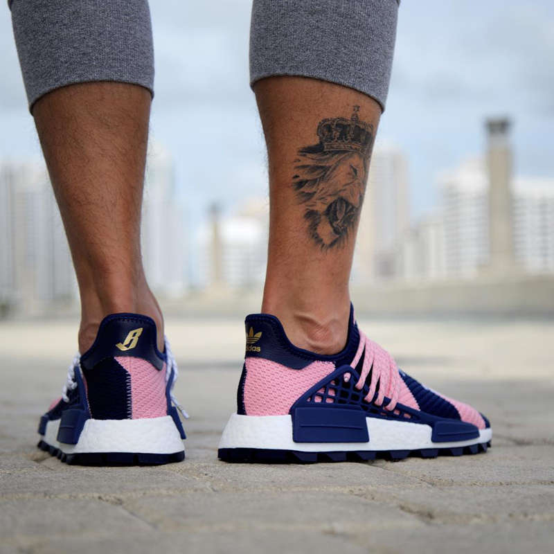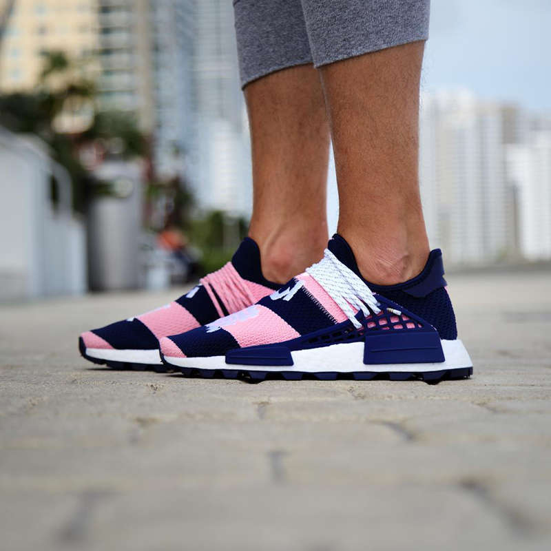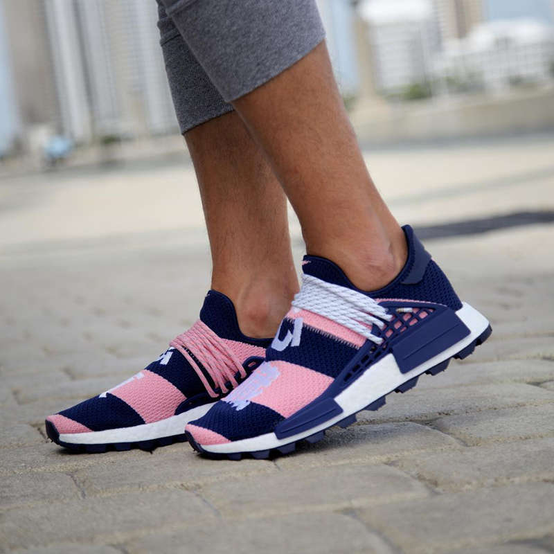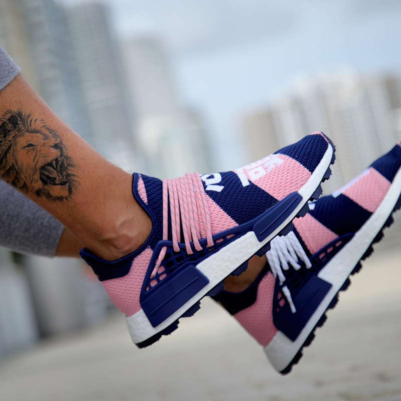 这双被命名为 「心脏 / 念头」 配色的 adidas Hu NMD,鞋身采用紫色与粉色的撞色横纹风格,并搭配相呼应的紫色支撑和稳定块。