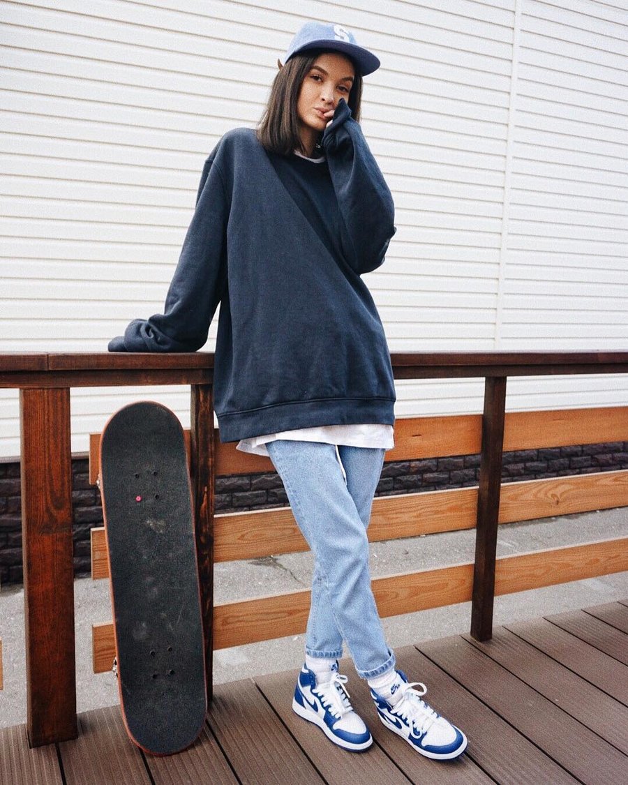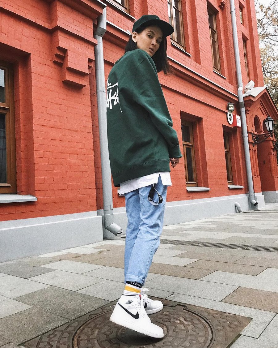 不论是衣服的款式还是颜色的搭配,都是如今流行的男友风,还有球鞋加持,女生们是不是也喜欢这样的小姐姐呢?