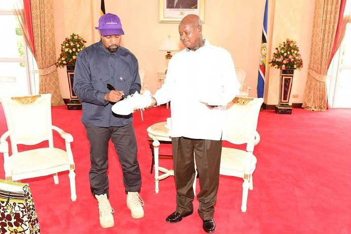 二人与乌干达总统在宴会厅相谈甚欢,随后阿侃还开启 “球鞋外交” 模式,除了赠予总统一双亲签纯白 Yeezy 外,更带了上百双给当地的小朋友!