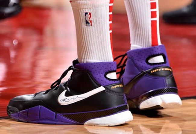 值得一提的是,在 NBA 揭幕战中塔克同样上脚了一双 Kobe 亲签的 Zoom Kobe 1 "Purple Reign"。