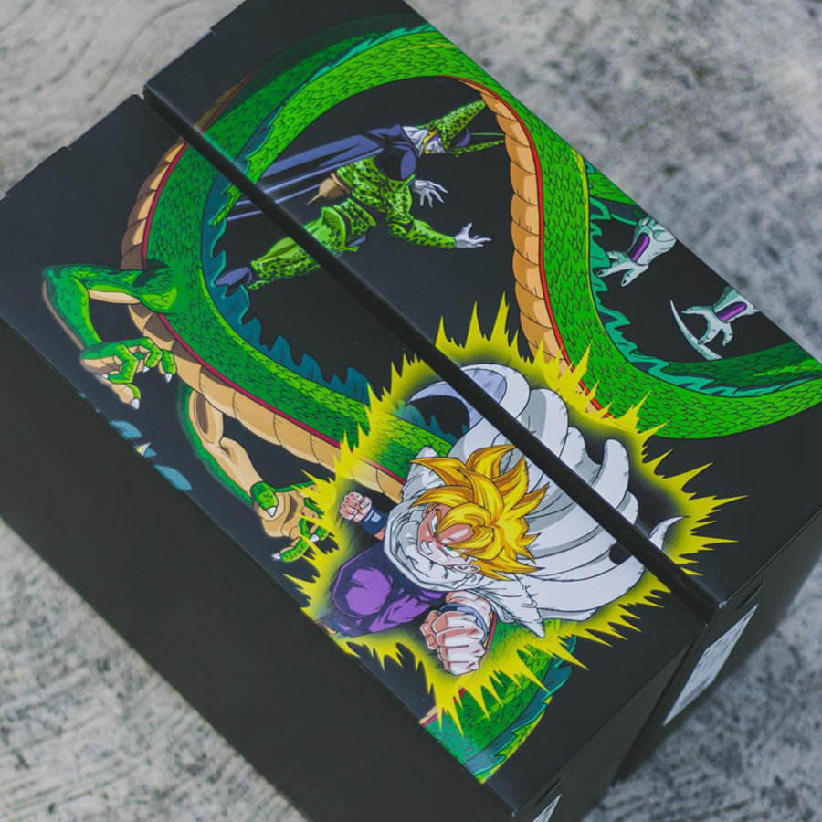 同样值得一提的是这次龙珠 Z 联名的鞋盒设计,一侧印有角色图片和代表序号的龙珠,另一边则是大家津津乐道的拼图设计,集齐 7 款即可组成完整图画。