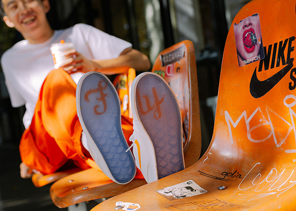 这是 FLY 与 Nike 合作推出的第 6 双鞋款,FLY 的中文名称“福徕爱”,以及店门前标志性的连排座椅等元素,均加入到整款鞋的设计之中。