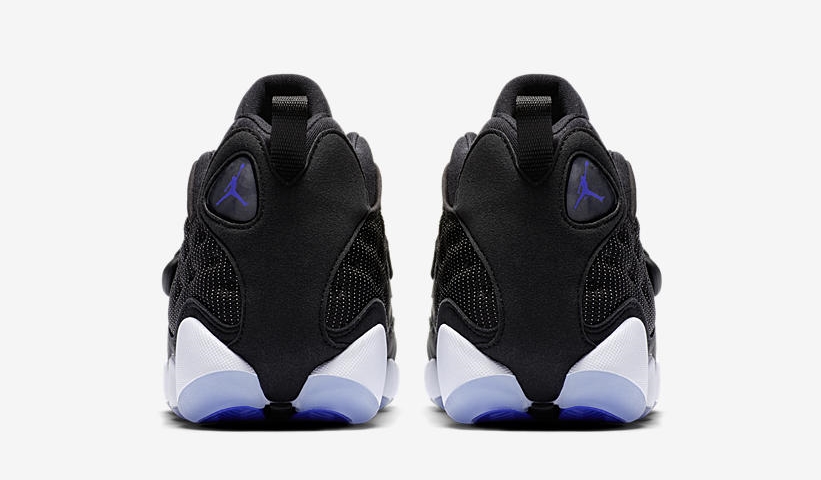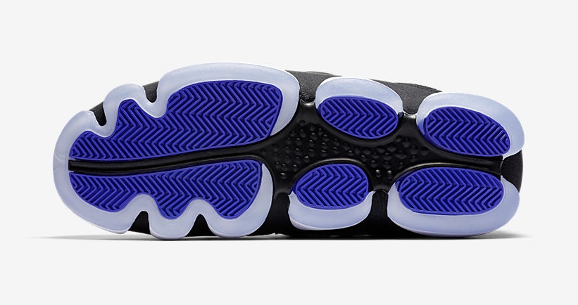 淡蓝的透明水晶外底辅以蓝紫色的人字纹橡胶部分,后跟手稿时期三角形全息 “猫眼” 设计中的飞人标志亦带有蓝紫色,完美还原 “大灌篮” 主题!