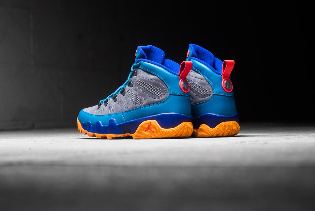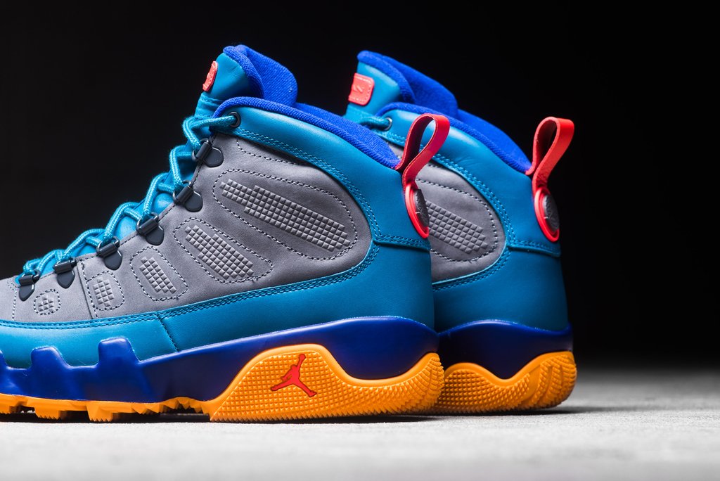 一直有着硬朗造型的 Air Jordan 9 还有定位户外功能的 Boot 靴型,前端时间带来一双大胆撞色风格的新品,近日球鞋店铺 @sneakerpolitics 带来实物美图。