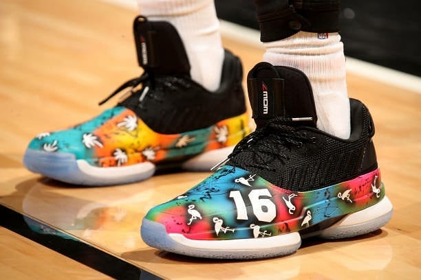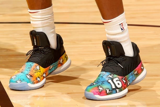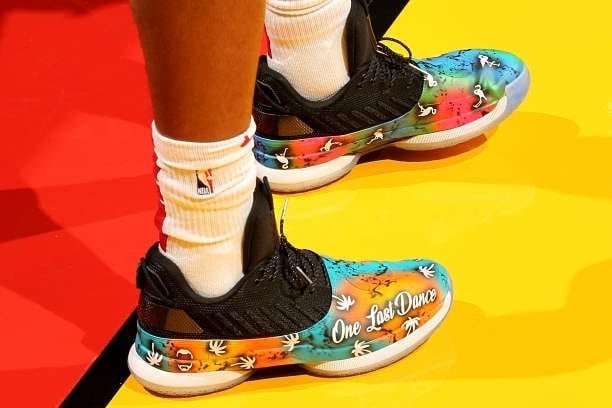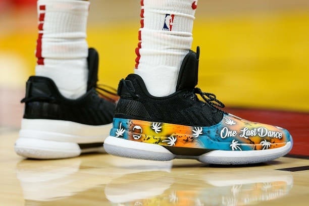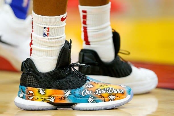 今日比赛中,骚韦上脚由球鞋定制师 SolesBySir 打造的 One Last Dance 专属定制球鞋。