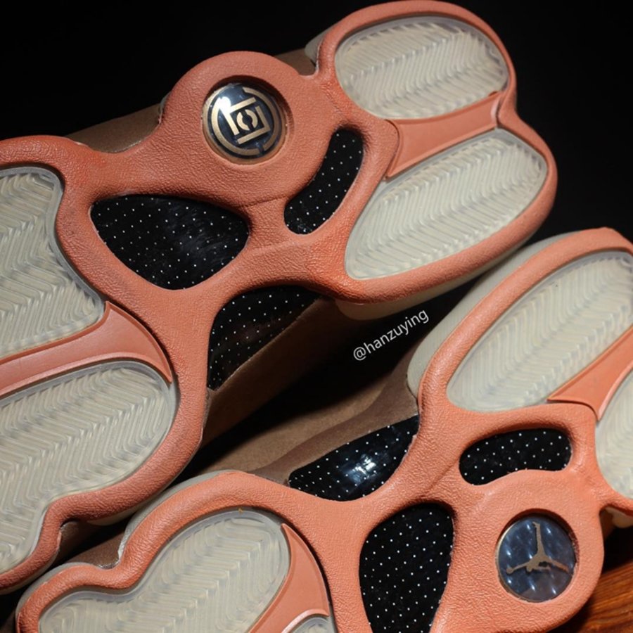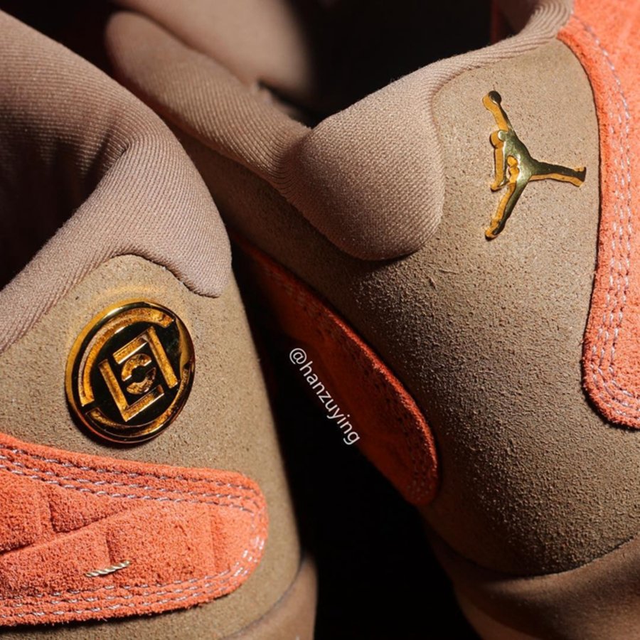 另外,除了 Air Jordan 13 醒目的 “豹爪” 采用果冻胶示人外,鞋面内外侧的皮革呈现也与熟悉的波点造型有所不同,格状纹理加线材贯穿,不禁让人联想到金缕玉衣或兵马俑这些极具中国特色的文化元素!