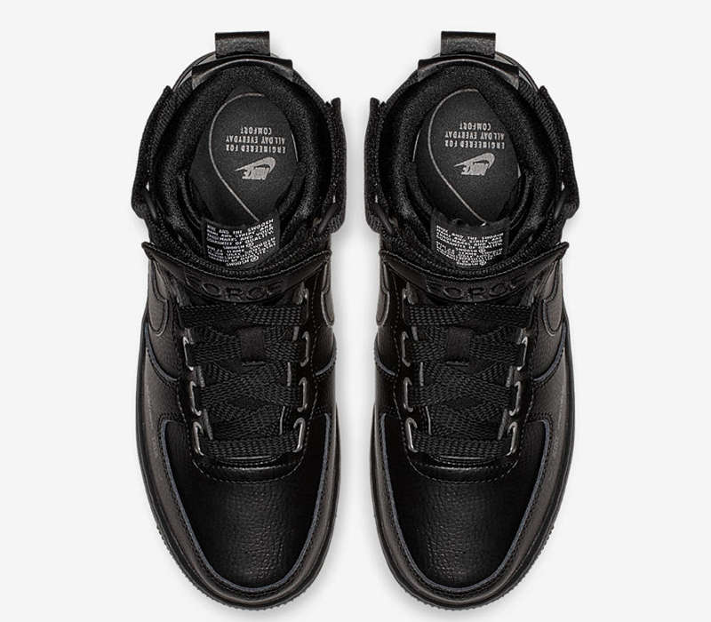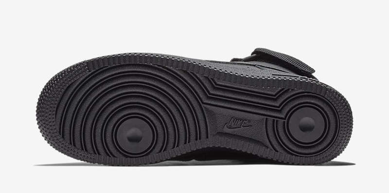 这双全新造型的 Air Force 1 High,以纯黑装扮,更是以黑色 Swoosh 点缀,并在鞋舌处加入黑色标签设计,彰显黑魂配色的魅力。