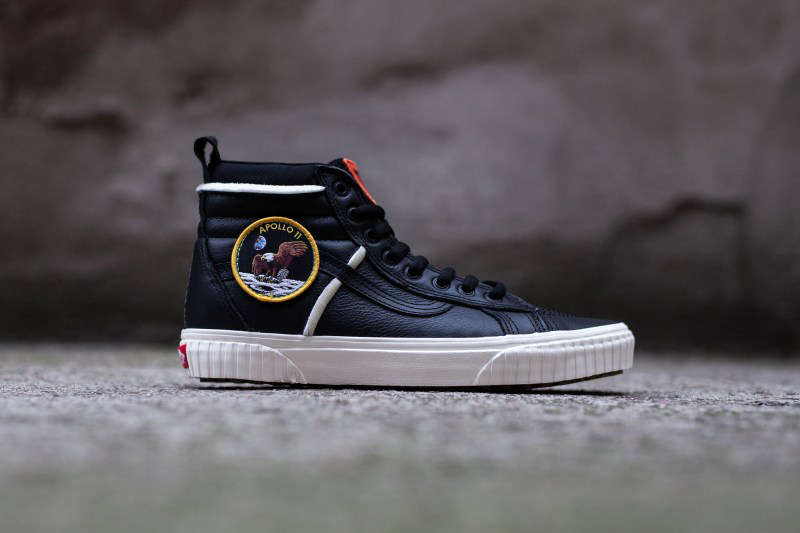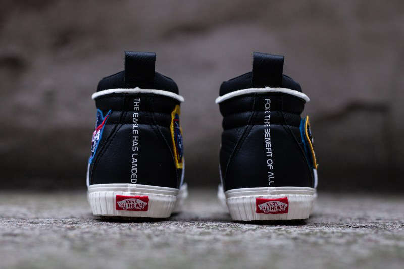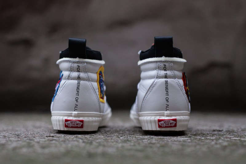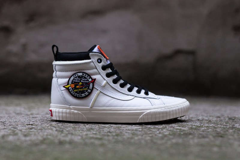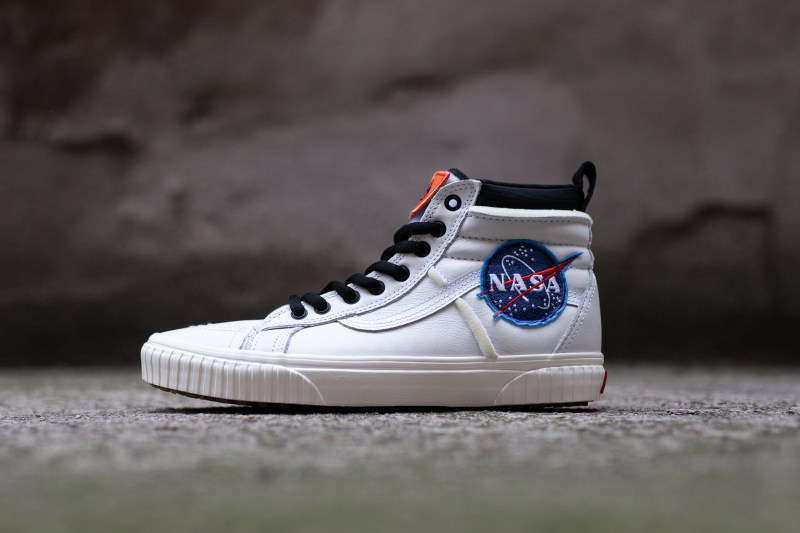 该系列中 SK8-Hi 46 以白、黑二色呈现,鞋身采用优质皮革打造,鞋帮两侧装饰着颇具航天元素的 NASA 刺绣魔术贴设计,大大增加了鞋款本身的趣味性。