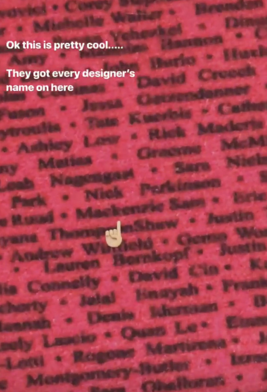 除了特立独行的外观,细节方面更是独一无二。后跟处带有每位设计师的专属字体刺绣,鞋垫上还密密麻麻地印满了每位设计师的名字,晒图的这位大佬也在上面找到了自己的姓名。