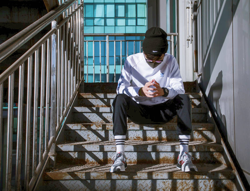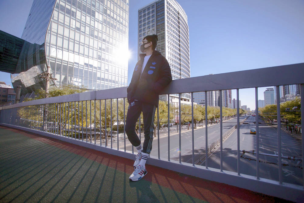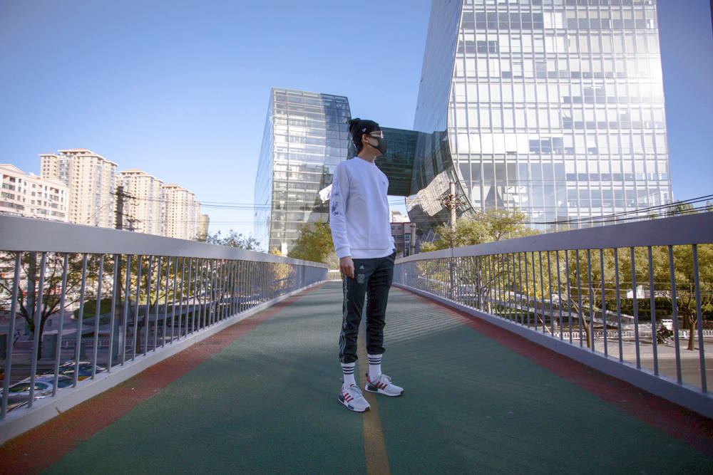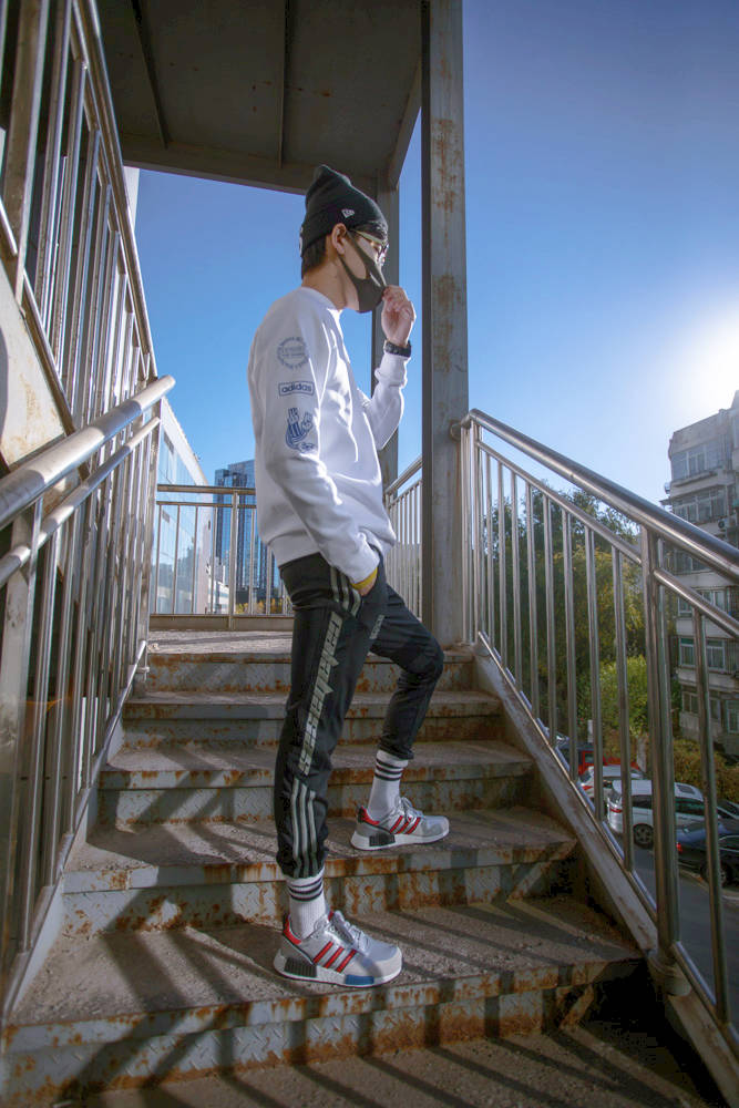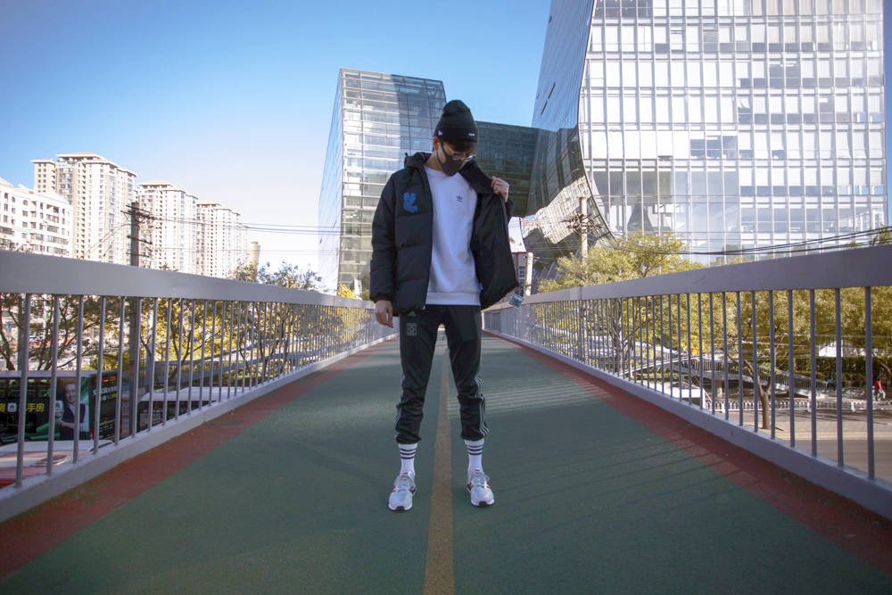 身穿拼接款黑灰夹克,内搭 adidas Originals 经典款运动卫衣。黑红配色的 EQT 后跟处与帽子采用同色系装扮。经典的黑红造型,完美诠释专属他个人的原创风格。