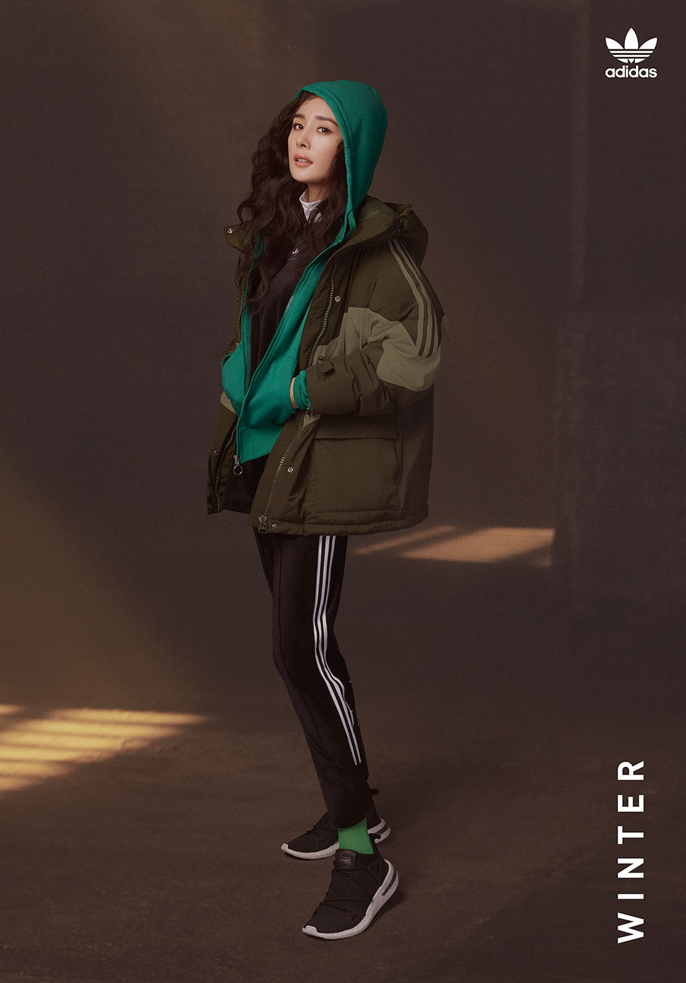 杨幂则选择将 adidas Originals 不同色阶的绿色服装进行叠加混搭,墨绿色的外套搭配绿色帽衫,天鹅绒材质运动 T 恤打底,整体搭配尽显层次感。