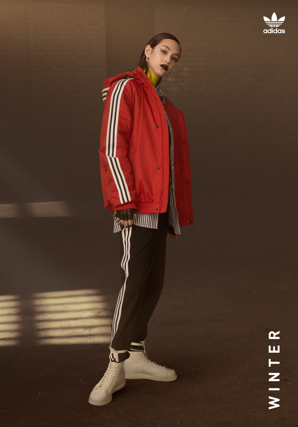 日本知名模特水原希子,本次则以高级街头风形象示人,暗色系的妆容与大红色 adidas Originals 运动夹克,在色彩上完美碰撞。