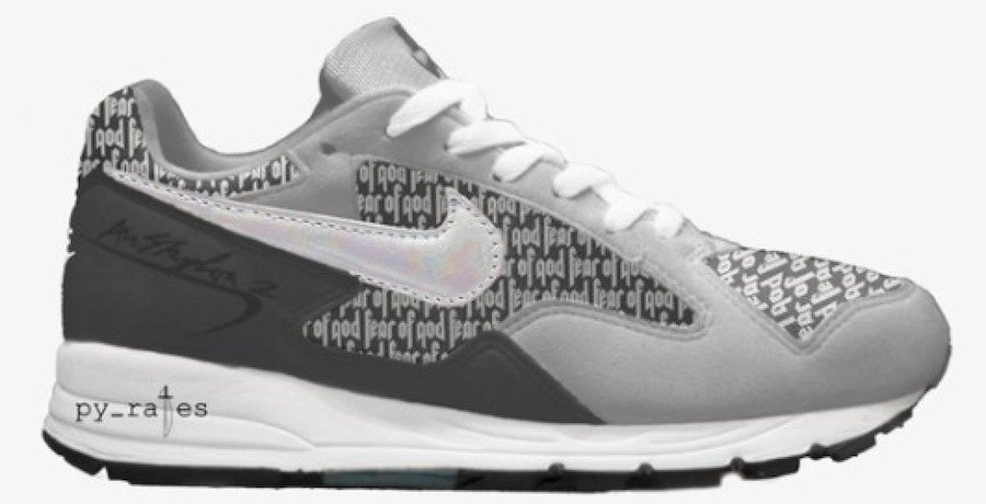 此次联名以小众复古鞋款 Nike Air Skylon 2 为蓝本,此前的效果图显示,联名系列包含三款配色,分别使用黑色、浅卡其和浅灰色分别与白色搭配,鞋身上布满 Fear of God 最经典的 Logo。