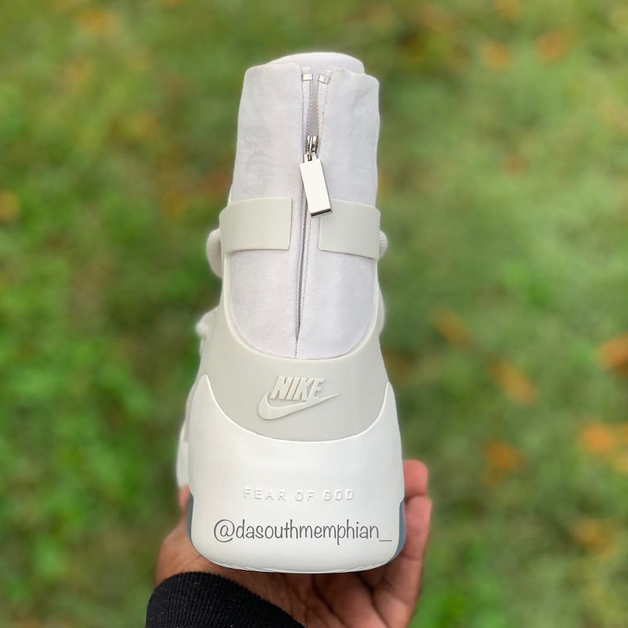 鞋面与后跟处均已双方 Nike、Air Fear of God Logo 点缀。后跟处的拉链设计以及可视窗气垫更是满满的机能风既视感。
