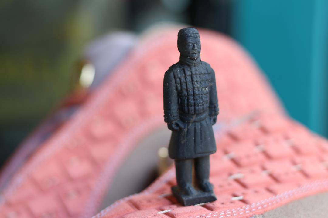 鞋款以脏橘、浅卡其与钱灰色麂皮材质打造鞋面,最大的亮点在于鞋面以格状纹理呈现,添加线材连接贯穿,不禁让人联想到兵马俑、金缕玉衣这些极具中国特色的文化元素。