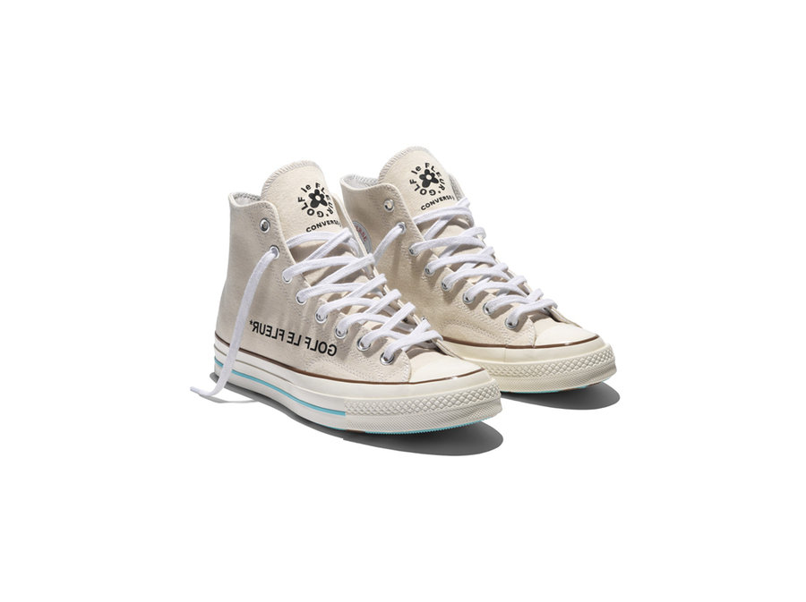 除了已经推出多款的 One Star 鞋型,Converse 最受欢迎的 Chuck 70 也首次加入小花装扮,鞋面上印有反向 GOLF le FLEUR * 字体,小花 Logo 则出现在鞋舌上。