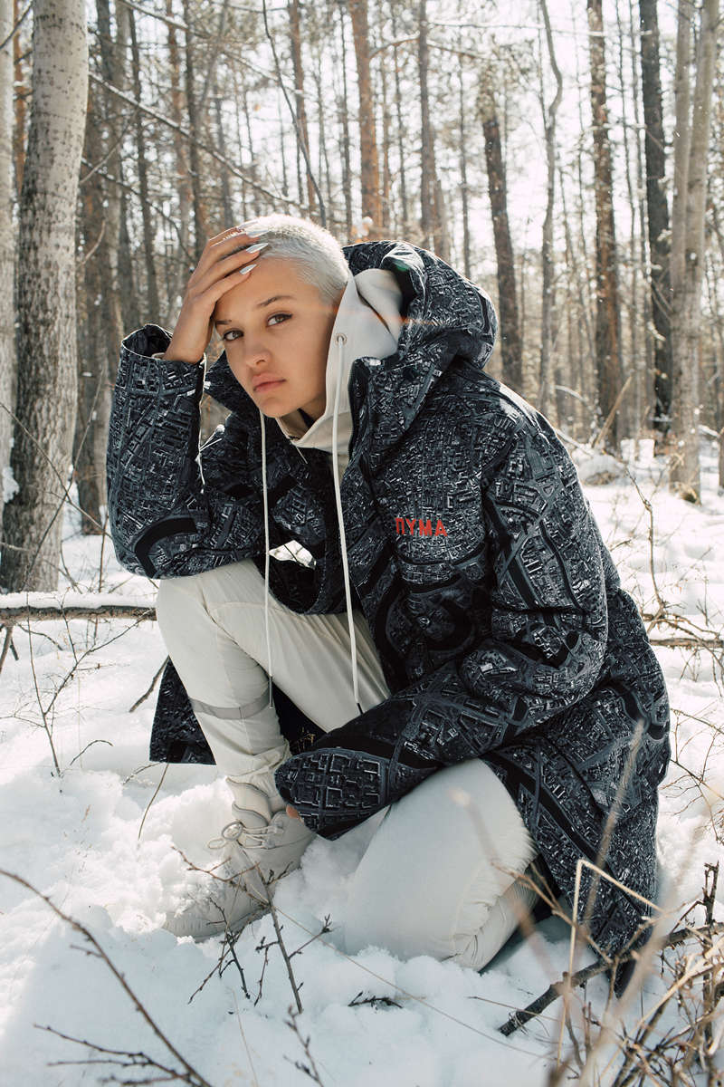 印有莫斯科卫星地图装饰的 PUMA x AYTΛO 羽绒外套,在设计上绝对是满满的科技感,融合机能性大口袋等元素。