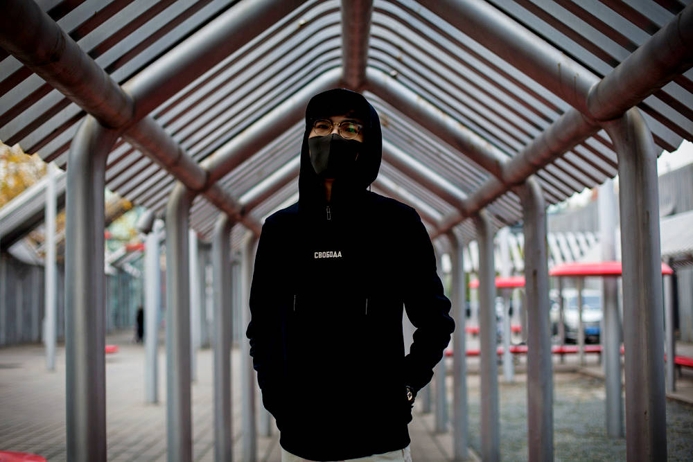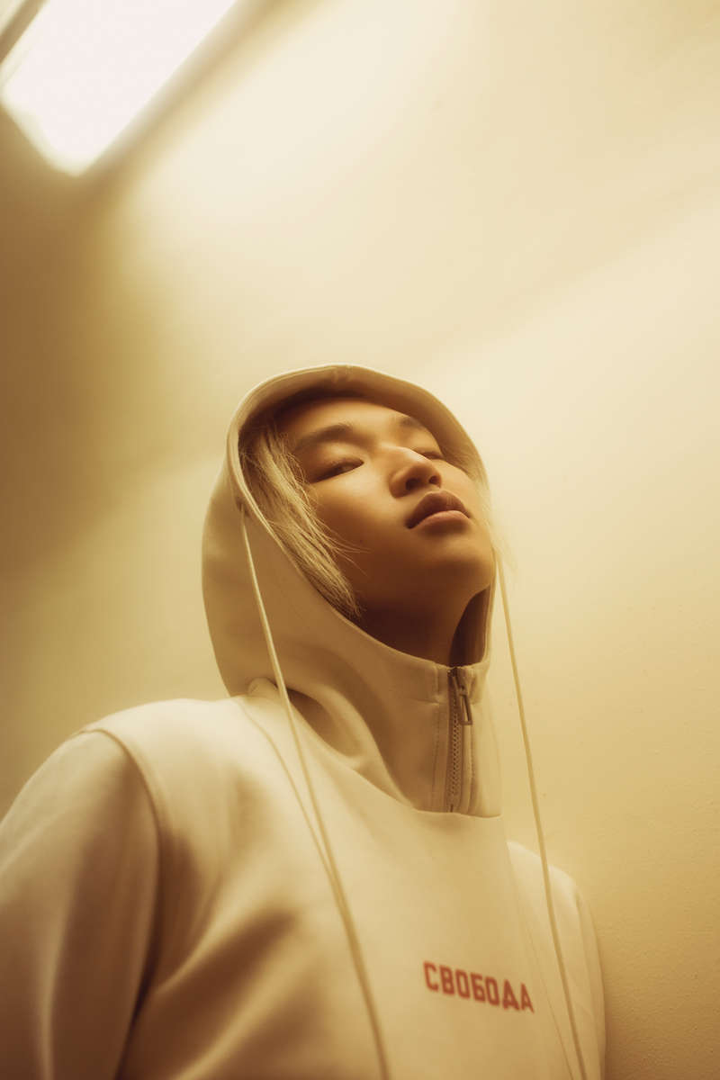 结合时装解构理念,将抽绳孔眼上移,营造出前所未见的异形设计,胸前点缀西里尔语文字的 “俄罗斯制造” 字样装饰,将现代造型与机能完美结合。