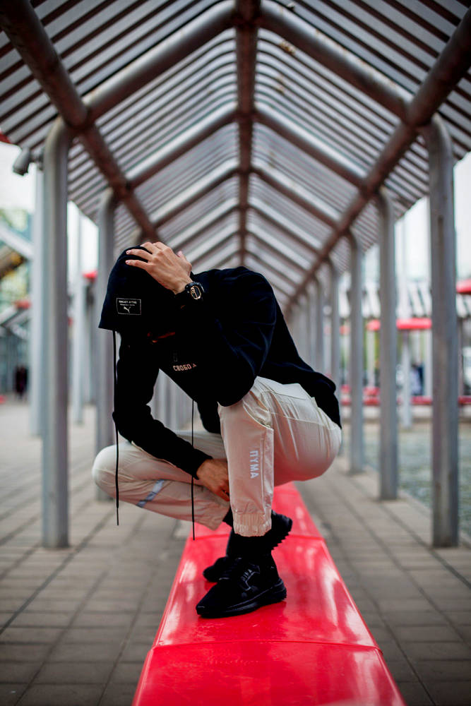 黑色的拉链帽衫与白色的质感有些不同,帽子顶部的 PUMA Logo 格外显眼。
