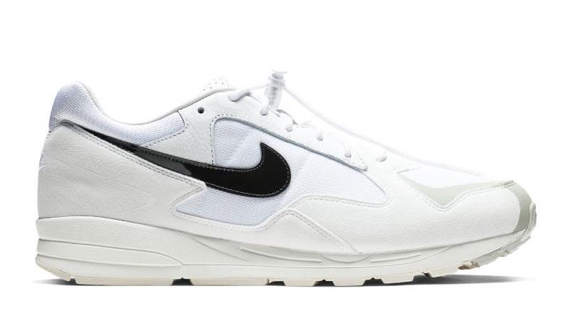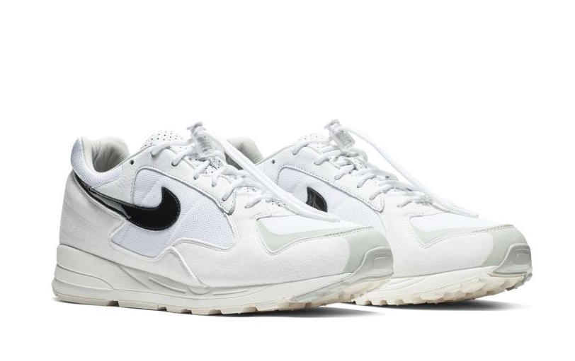 这双鞋以小众复古鞋款 Nike Air Skylon 2 为蓝本,简单的黑白灰三色覆盖,鞋带上加入全新的鞋扣设计,风格与 Fear of God 相符。