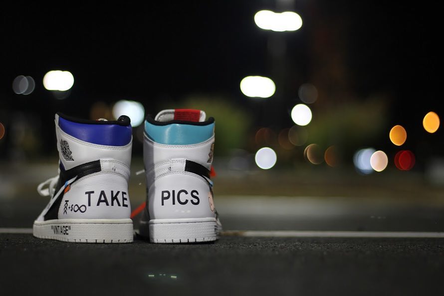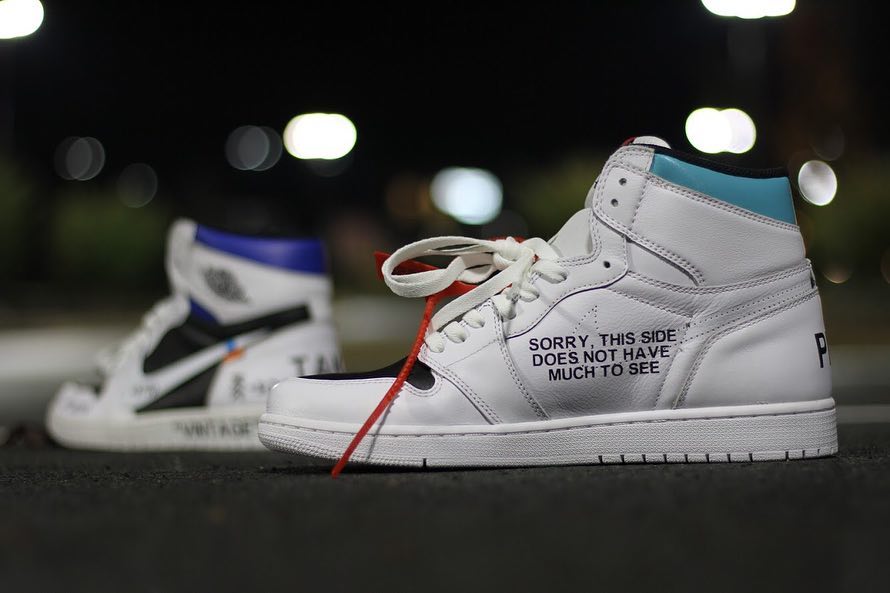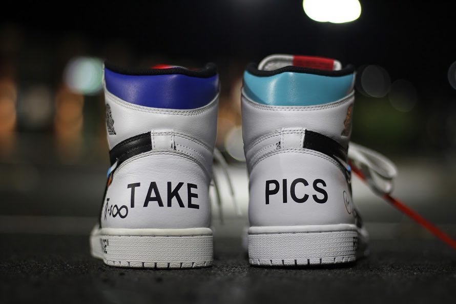 除了中底上醒目的 “RESELL ME” 标语外,整双鞋总还融入近两年最火爆的设计元素,在 OFF-WHITE x Air Jordan 1 的外形基础上,加入 Fragment design 的闪电 Logo、Mini Swoosh、各种趣味标语,最逗的是在每处细节都标明了价格,似乎也在讽刺品牌无脑印 Logo 的联名做法。